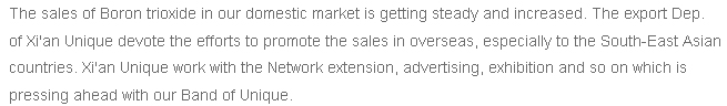 | Xi’an Unique Electronic & Chemical Co., Ltd. Copyright 2012 ADD: 1703 # B Building West Electronic Zone New and High-Tech Industrial Development Zone, Xi’an, China, ZIP: 710065 TEL: 0086-29-88238008, 88238009 FAX: 0086-29-88249438 E-mail: sales@china-unique.com |